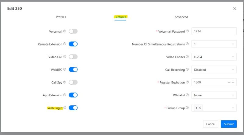برای استفاده از فکس در سیستم زایکو در ابتدا یک داخلی مخصوص Fax ایجاد میکنیم. و در قسمت Features تیک گزینه WebLogin را فعال میکنیم تا بتوانیم با استفاده از یوزر و پسورد داخلی به پنل لاگین کنیم.