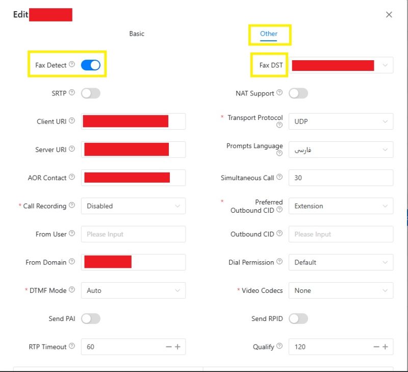 پس از ایجاد داخلی نیاز هست که در تنظیمات ترانک که از قبل داریم تیک گزینه Fax Detect را فعال کنیم و یک مقصد تعیین کنیم که همان داخلی که از قبل ایجاد کردیم است.