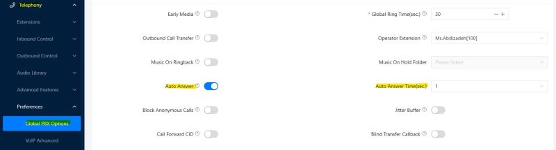 بعد از این موارد نیاز هست که در قسمت PBX Global Settings گزینه Auto Answer با تایم 1 ثانیه فعال شود.